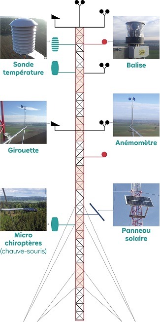 Un mât de mesure est installé afin de recueillir des données locales. Ce mât de mesure, d’une hauteur d’environ 105 mètres, est équipé de plusieurs types d’instruments de mesures, à différentes hauteurs : des girouettes (direction du vent) et anémomètres (vitesse du vent). Des micros à ultra-sons y sont également installés durant certaines périodes de l’année, afin de compléter les données de l’étude faune et flore sur l’activité des chauves-souris en altitude.